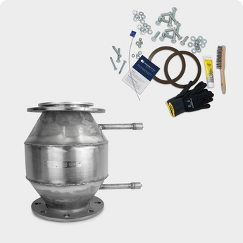 The catalytic converter is supplied with accessories consisting of 1x seal, 2x cotter pin screws M16x50 (including nut, washer and spring ring), assembly gloves, copper paste, wire brush, 2x flat seals DN150 and 14x screw package M16.
