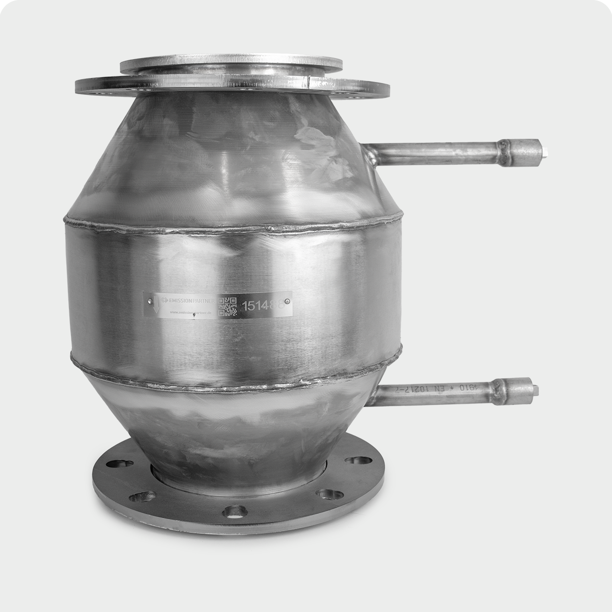 Catalyst for installation in the exhaust pipe with a loose flange design for secure installation. Two catalytic converters are used in dual-flow exhaust systems. Suitable for MAN engines "MAN HAGL 3268", "MAN HAGL 3262", "Dreyer & Bosse MAN 2842" and "Dreyer & Bosse MAN 2848" of the E28 and E 32 series.
